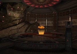 Transport to Sanctuary Fortress is a room in the Temple Grounds on Aether. It appears in Metroid Prime 2: Echoes. It is a small enclosed room, which seems to be slightly caved-in on one side. It looks technologically advanced, as most of the walls are composed of metal, except for the caved-in side. The metal on the walls is dark brown, making it look worn-down and old. There are several structures along the walls that resemble Spider Ball Tracks, yet they are not usable, and are probably just for decoration. In the middle of this room is an elevator, which takes Samus to the Sanctuary Fortress. Samus must scan an Interface Module to activate the transport.