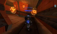 The first chamber of the underground tomb is a winding maze containing Thermo Spheres that encircle the tunnels, and pits of lava. The Marines carefully navigate the maze and reach the center, which contains a pressure pad (all of the rooms are connected by a pressure pad door). Upon using it, the Marines are dropped further down into a damaged chamber with perpetually falling boulders, a dedicated terminal and the lead Marine's Mech. In multiplayer sessions, the other Mechs are found elsewhere in the mission, making it much more dangerous. However, remaining suitless allows the soldiers to access a number of MODs in the tomb, which are inaccessible with their Mechs.