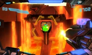 The Marines make it past the boulders to a batch of rubble covering the exit. In the next chamber, a series of bridges and platforms, the Marines are accosted by Flying Pirates. At the end of this chamber is a bridge suspended above lava, with a switch that must be shot repeatedly to lower the bridge. Through here is a corridor lined with lava falls, which leads into an outdoor corridor with rising and falling Thermo Spheres, and Fire Hoppers. After the lava portion is a longer corridor filled with Pirate Troopers, which leads to a small room with crates that may contain AUX ammo. This comes out to a room that is half suspended above lava, and half dry land.