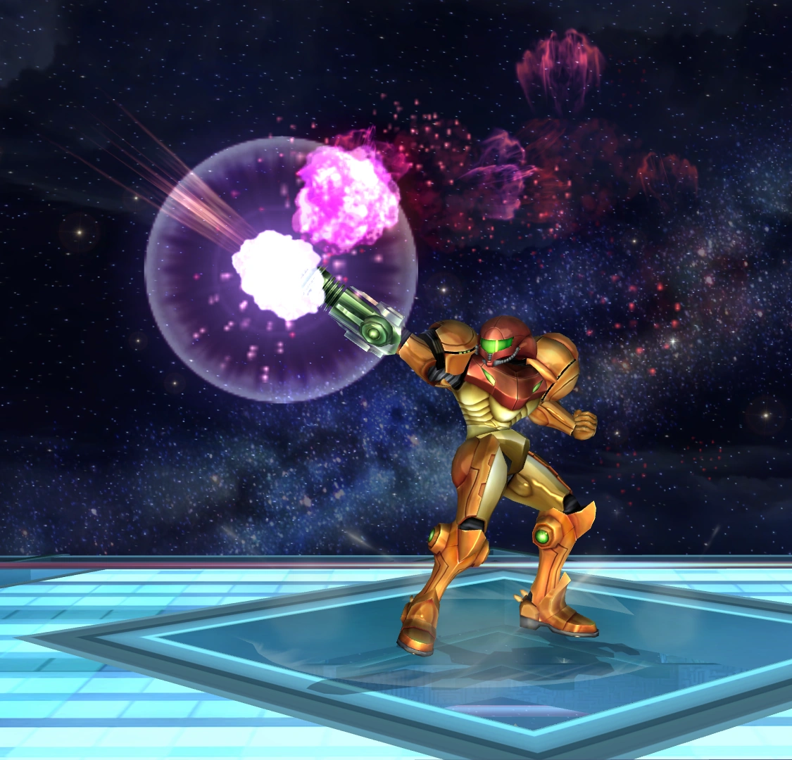 "Samus uses her arm cannon in an arc above her head. This can hit grounded opponents but more often hits multiple times against airborne opponents."