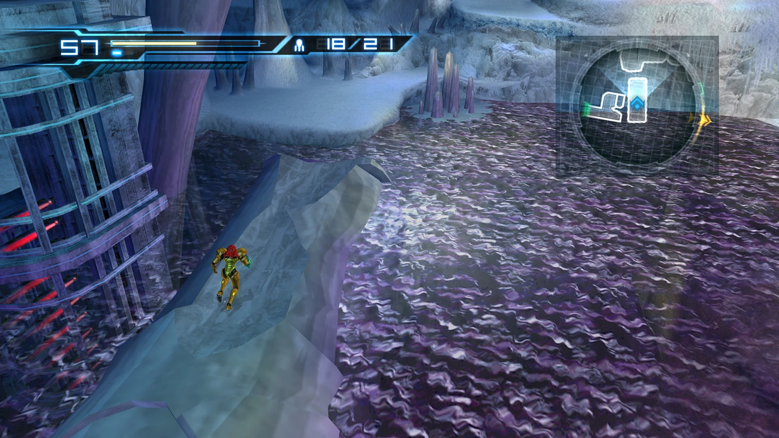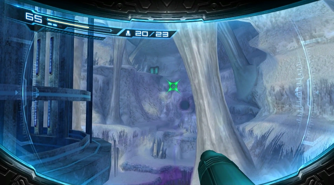 On the back wall is a series of platforms, each of which have icicles hanging off of their sides. One platform has a small stream that flows into the pond, and seems to originate from within the wall. It may be runoff from the ice. In the center of the wall is a large ice column that obstructs further progress. To remove it, Samus must fire a Missile at its base to form a puncture, and then, similar to that in the "ice passage", Samus must enter Morph Ball mode and lay a Bomb in the puncture to break the column off. The broken column falls to the floor below, and the base of it can now be stood on and crossed over. Multiple Snomers appear as Samus crosses the room, and near the exit door she encounters some Joulions as well. The door leads into the Water Tank.