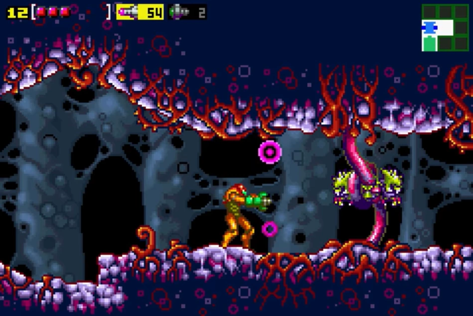 - "Stinging vines curl out of the floor and hang from the ceiling of the long corridor that leads to the save room. Hit the vines with your beam and use missiles to destroy the enemies that are caught in the vines.."