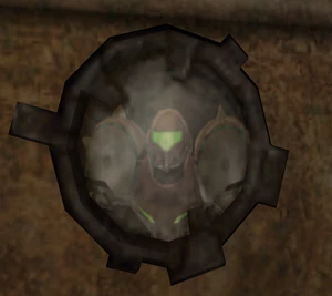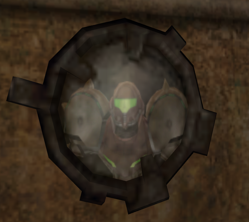 Wall hangings are recurring mirror objects within Tallon IV's Chozo Ruins. They have a highly reflective surface, and their scan states that they do not appear important, suggesting that they are merely decoration. Should Samus look into one, she will see her reflection. However, if she jumps, she is not seen Spin Jumping as in the Metroid Prime 2: Echoes Multiplayer mode; the animation remains the same as the first jump.