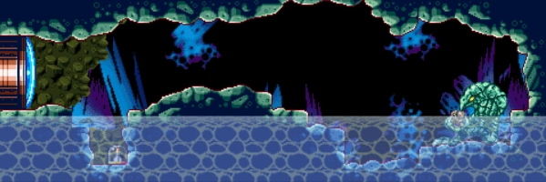 This is a short corridor located in a cave underneath a large stretch of Chozo Ruins in Crateria, the surface of Zebes. It is accessed through a tunnel in the floor of that room. The corridor is flooded with water, with only small portions of the rocky floor peaking above its surface. A gap in the floor is covered by a Chozo Block with an etching of the Plasma Beam item; underneath it is a Missile Tank (see below).
