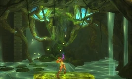 In Samus Returns, the water-filled room has been redesigned to match the jungle and marsh theme of Area 5. For the most part, the water-filled room appears to be a natural cavern with a jungle habitat, populated by magenta trees, pink mushrooms, and large green vines, branches, and roots. However, there are a few artificial structures visible in the room, most notably including a Teleport Station. As the name indicates, it is also flooded with water, with several small waterfalls pooling at the bottom of the cave.