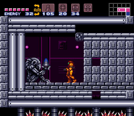 - "Grapple through the spike-filled room, then Bomb and shoot around to find your way past the gates and over to the Chozo Statue that holds the X-Ray Scope. Use it often."