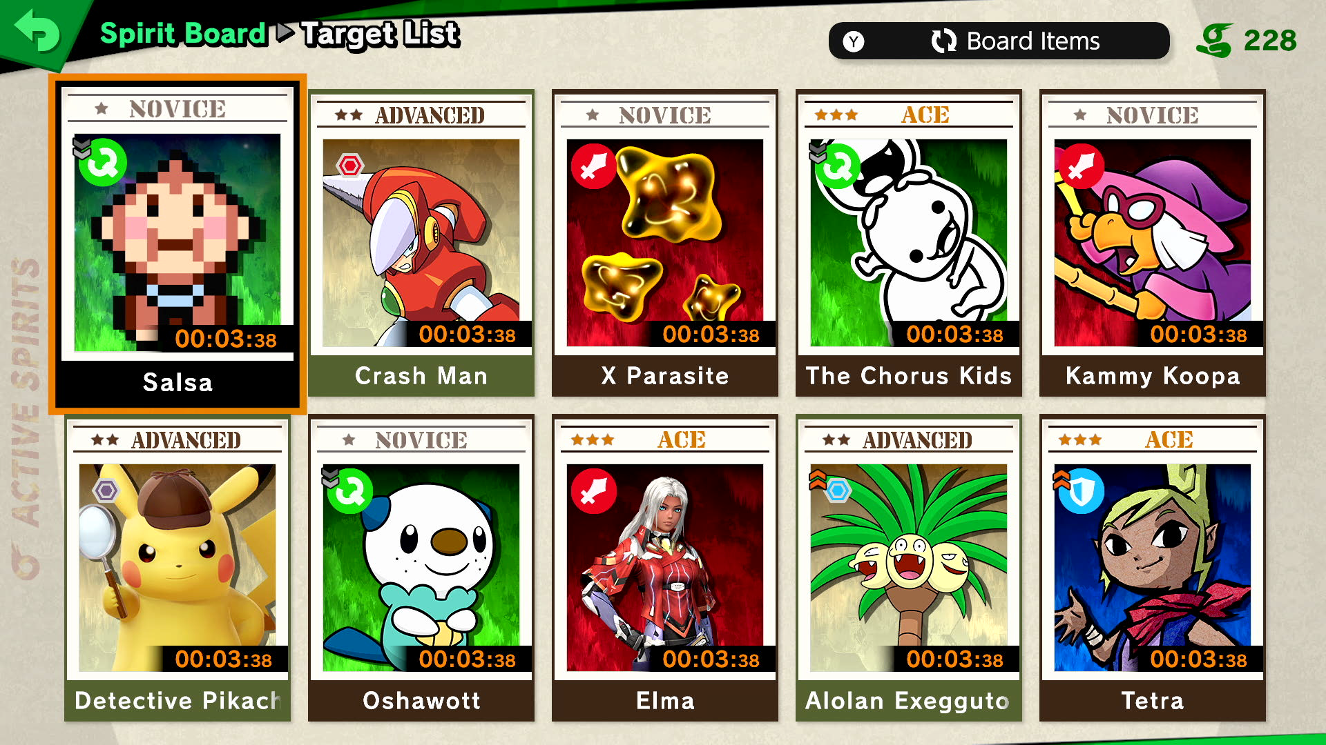 The X Parasite can be obtained through the Spirit Board or purchased from Beedle's Tent. In its Spirit Battle, the X Parasite uses Kirby as a Puppet Fighter, most likely since they are both blob-like beings that consume other creatures and copy their abilities. The player must defeat a team of ten Kirby Puppet Fighters appearing in their yellow "Keeby" alternate costume. Each Kirby is more likely to use their Inhale move to copy the player's character. The Spirit Battle takes place on Lylat Cruise, with Sector 1 as the background music.