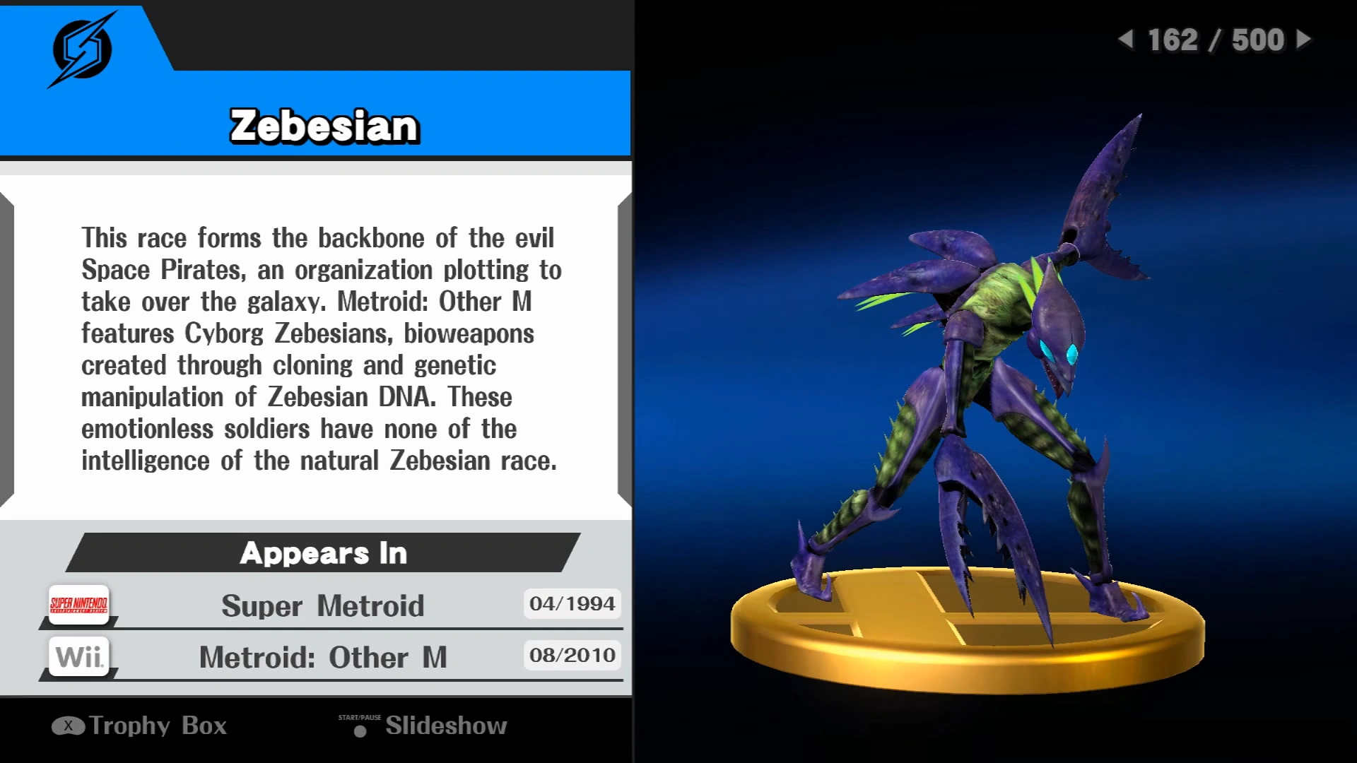 However, it is heavily implied in Other M Samus is referring only to the Cyborg Zebesians and Super Zebesians, as her the imagery accompanying her words specifically shows them instead of regular Zebesians. The cloned Zebesians seem to be more feral than normal Pirates, since they have not formed any sort of coherent society or manipulate the BOTTLE SHIP's equipment in any way, even though there has been a significant amount of time between their release and discovery by Samus. This is heavily supported by the Zebesian's Trophy in Super Smash Bros. for Wii U, which states that the BOTTLE SHIP Zebesians were intentionally made as emotionless bioweapons that lack the natural Zebesians' intelligence to allow the Federation to control them better.