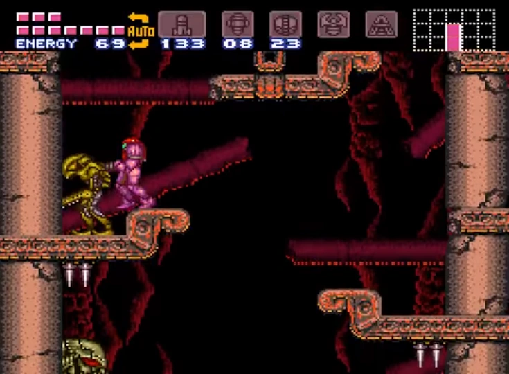 Group of Zebesians in a prototype of Metroid: Zero Mission. Note the avian-like heads and the environment which hints at an earlier appearance in Brinstar.