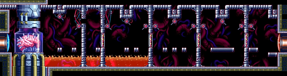 In the original game, the first battle with Mother Brain took place within the Zebesian Command Center and the room itself was relatively simple in appearance with no background. The entrance was on the far right side of the room and Mother Brain was located on the opposite side, but between these two ends were five Zebetites, 15 Cannons and 14 Rinka generators. Five floating platforms were present for Samus to use as she moved towards her target, with the last few being particularly useful to avoid the pools of lava that fill the last segments of the corridor. After destroying Mother Brain, the metal wall behind the Control Capsule is transformed into a Blue Door and the self-destruct sequence is triggered, leading to the destruction of the Command Center and leaving it in ruins.