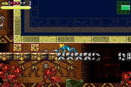 This is a large room in the middle of the Chozodia ruins. It is a long corridor with a low hanging ceiling, that drops into a lower vertical shaft. The room's central feature is a "pit" of four Zebesians, pacing back and forth below a bridge of Pit Blocks that have a delayed crumble. Samus must quickly crawl across the bridge, shooting Fake Blocks in her path, to avoid falling into the pit. If she does, she can climb out through the far right side of the pit after shooting a block. After the pit, Samus will run across a floor of Pit Blocks dropping her into the shaft. An alcove on the lower right of this drop has a fifth Zebesian in it, who may spot Samus. On a Perfect Stealth run, Samus can quickly shoot the left wall below the Pit Blocks and grab the ledge, then drop down when the Pirate is facing away from her and stun it. A demonstration of this can be viewed here.